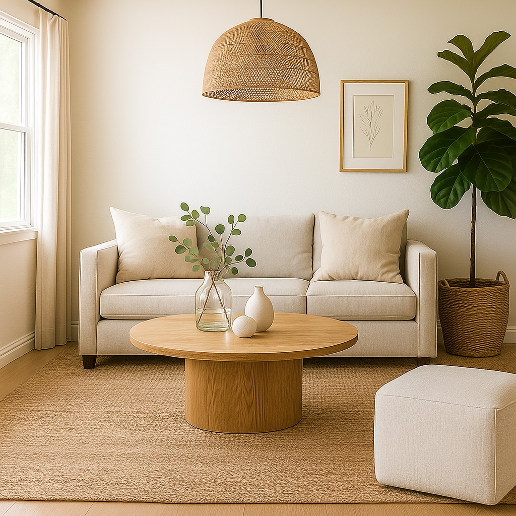 Sumá una carpeta rectangular de yute bajo la mesa de centro para dar textura y definir el espacio.