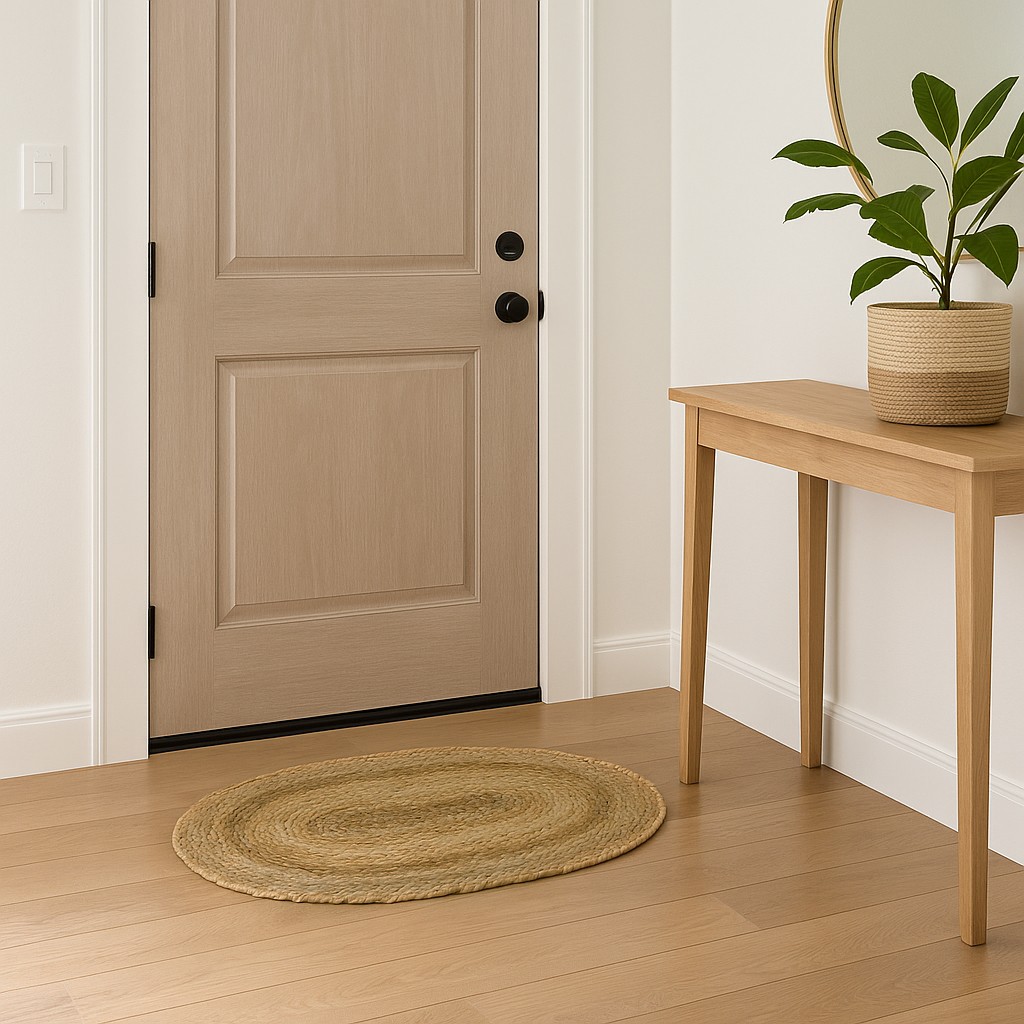 Un felpudo ovalado de yute trenzado aporta calidez desde el primer paso.