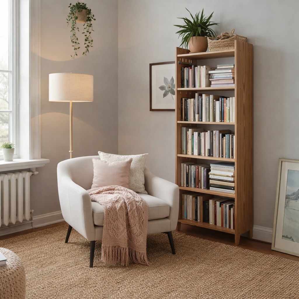 Un espacio de lectura o relax gana calidez con una carpeta de yute y un puff o manta suave.